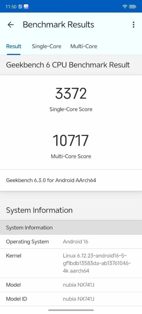 Geekbench 6的测试数据进一步印证了第五代骁龙8至尊版处理器的性能提升。单核得分3372,多核得分10717。多核性能的显著提升,使得努比亚Z80 Ultra应对复杂多任务场景时更加从容。对于商务人士和职场用户来说,他们经常需要在移动办公场景下同时处理多个工作应用,努比亚Z80 Ultra的多核性能优势能够显著提升工作效率。