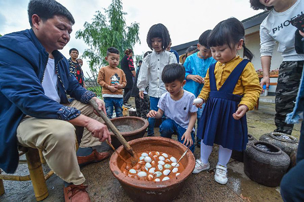 5月4日,丁山河村村民在老刀糕饼铺等老字号传统艺人的带领下腌灰鸭蛋。临近立夏(5月5日),浙江省杭州市余杭区塘栖古镇丁山河村的村民们举行了一场“民俗迎立夏”活动。成群结队的儿童走村串户,挨家挨户“派野米”(每家每户要米),在河边地头搭土灶,生野火,烧野米饭(又称乌米饭)。民间美食艺人和孩子一起现场用米塑做“立夏狗”,腌灰鸭蛋(咸鸭蛋),寓意吃了立夏狗,小孩身体健壮顺利成长;吃了野米饭,将来走四方成大业。
