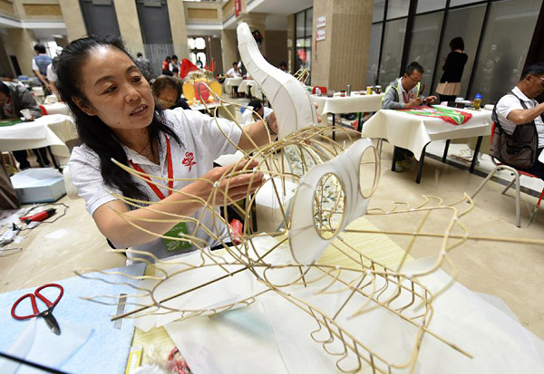5月4日,2017年全国传统风筝制作技艺大赛现场,一名参赛者在制作风筝。当日,2017年全国传统风筝制作技艺大赛在河北省廊坊市安次区进行,来自全国各地的48名中国传统风筝制作高手同场切磋技艺。