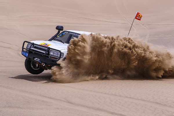 5月4日,车手在比赛中。当日,新疆玉都且末沙漠汽车越野争霸赛在新疆且末县开赛,共有48辆赛车参赛。本次比赛赛道设置在世界第二大流动沙漠——塔克拉玛干沙漠中,要经过被称为“魔鬼赛段”的英吾斯塘乡。比赛将持续到5月6日。