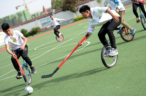 5月4日,西安市马腾空小学六年级学生马姬飞(右)在独轮车曲棍球比赛中射门。马腾空小学自2013年起将独轮车引进校园体育课程。随着独轮车项目的推广,马腾空小学学生参加《国家学生体质健康标准》测试合格率逐年稳步上升。目前独轮车项目已经在马腾空小学三至六年级学生中广泛普及,全校有160余名学生参与到独轮车体育运动中,并在师生的共同创新下开展了基本骑行、花式骑行、独轮车篮球和独轮车曲棍球等丰富多样的项目。