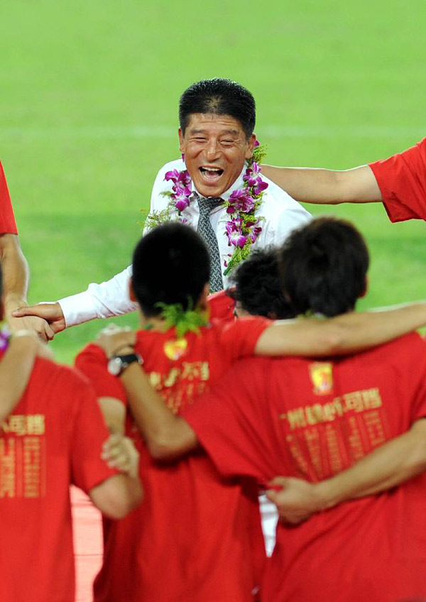 5月4日,长春亚泰足球俱乐部发布公告,宣布球队韩国籍主教练李章洙不再担任主教练。现年61岁的李章洙有韩国“铁帅”之称,并有多年的中国球队执教经验,曾先后执教过重庆力帆、北京国安、广州恒大等球队,并斩获过中超、中甲、足协杯等国内各项赛事的冠军。图为2011年10月16日,广州恒大足球队主教练李章洙(中)与队员一起庆祝提前夺冠。